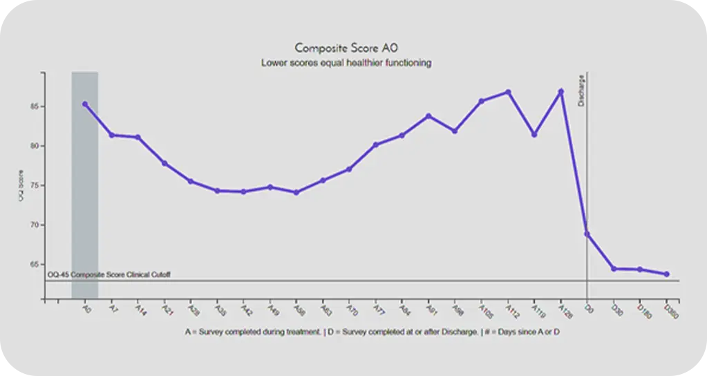 The OQ 45.2 Questionnaire is one of tools we measure and the chart below (n=8302) shows patients’ progress and improvement from admit, through treatment to 365 days post treatment.